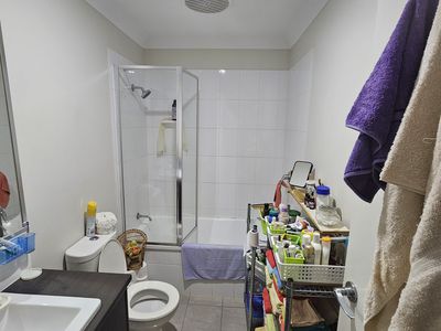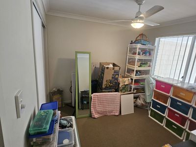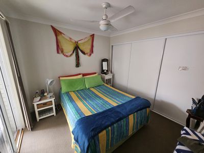 Both large bedrooms include built-in wardrobes, carpet, and ceiling fans. The central bathroom is tidy and practical, including a toilet for added convenience.